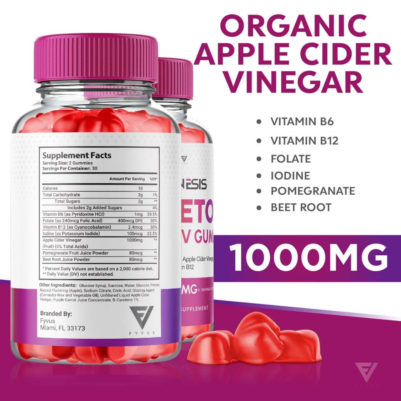 - Genesis Keto - Genesis Keto ACV Gummies advanced weight loss contains beet root powder and pomegranate juice known to help aid increased enery and stomach fat. Each serving of acv gummies contain 1000mg of apple cider vinegar supplement