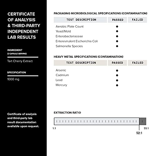 - The Highly Concentrated Form of Tart Cherry - Toniiq Tart Cherry Capsules contain 1,000mg of the highest quality tart cherry extract in each serving – ethically sourced from family-owned farms, grown and cultivated using an extraction process to ensure a 52:1 extract ratio (or the equivalent of 52,000mg of tart cherry powder).